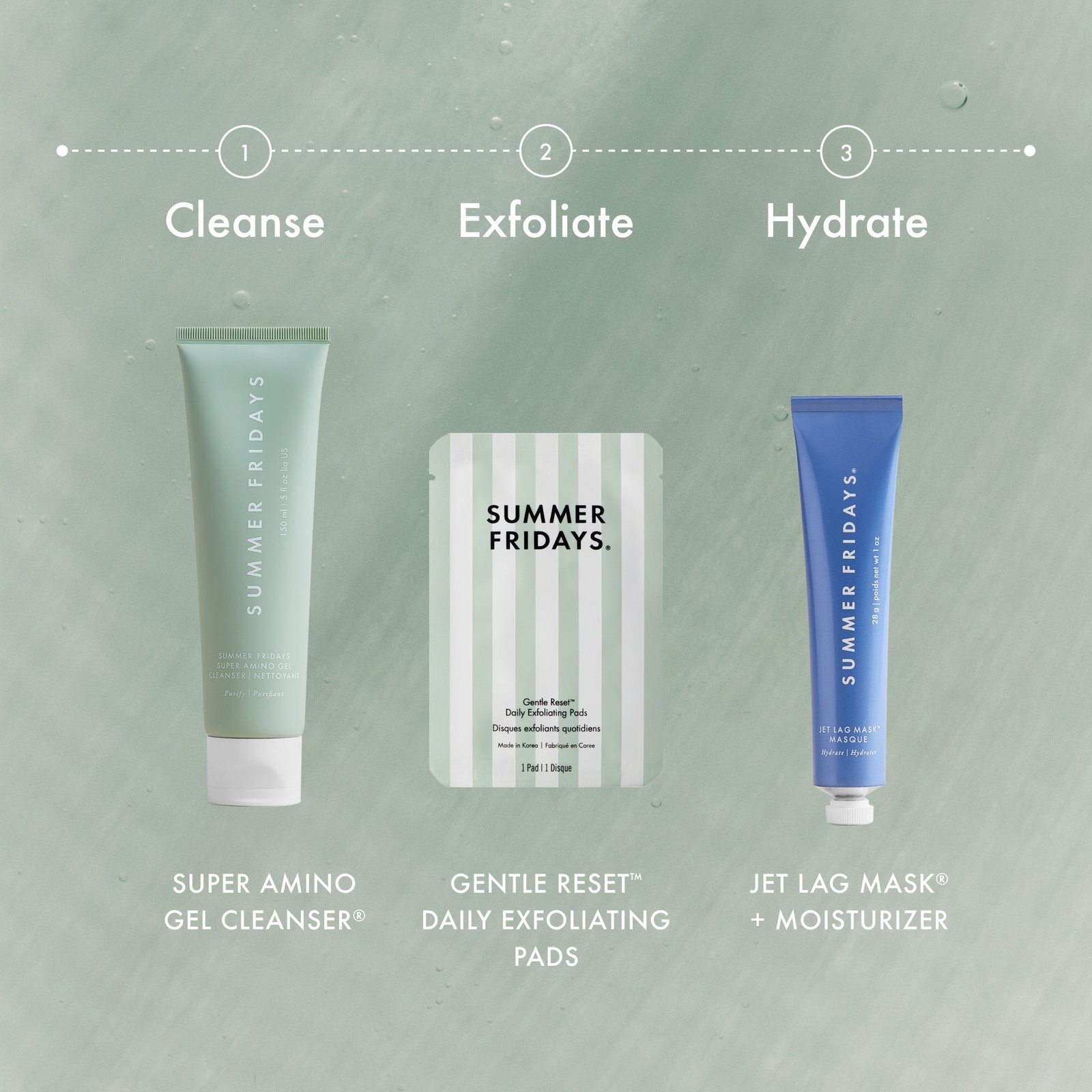 Reset wherever you are. This everyday trio features three effortless steps to gently cleanse. exfoliate and moisturize skin. day or night.